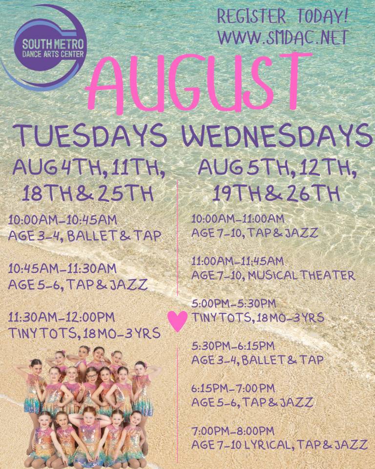 Join us this August at South Metro Dance Arts Center for an exciting lineup of dance classes designed for every age and ability. With sessions running on Tuesdays and Wednesdays throughout the month, there’s something for everyone—from Tiny Tots to growing dancers ready to explore ballet, tap, jazz, and musical theater.