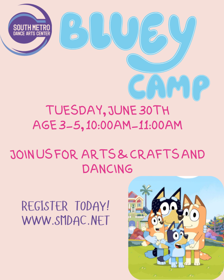 Get ready for a morning of creativity, movement, and Bluey-themed fun at South Metro Dance Arts Center! Join us on Tuesday, June 30th from 10:00am–11:00am for a special Bluey Camp designed for children ages 3–5.