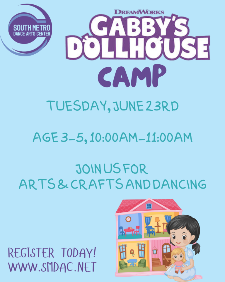 Join us at South Metro Dance Arts Center for a Gabby’s Dollhouse–themed camp your little one will love! On Tuesday, June 23rd from 10:00am–11:00am, children ages 3–5 are invited to step into a world of imagination, creativity, and movement.