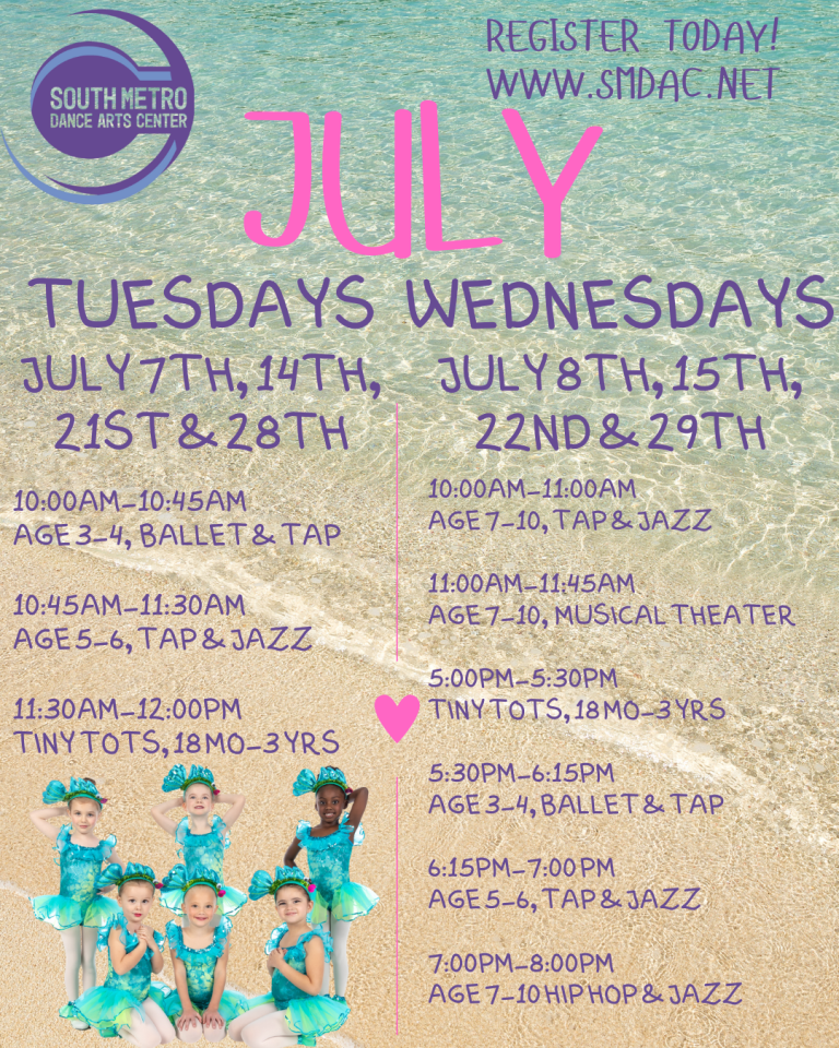 Keep your child moving, learning, and having fun this summer with our July dance classes at South Metro Dance Arts Center! With sessions available on Tuesdays and Wednesdays throughout the month, dancers of all ages can explore ballet, tap, jazz, hip hop, musical theater, and more in a positive, encouraging environment.