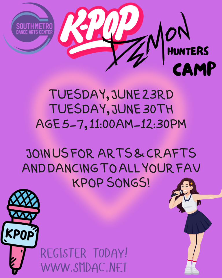 Get ready to move, create, and perform at our high-energy K-Pop Demon Hunters Camp at South Metro Dance Arts Center! Designed for kids ages 5–7, this exciting themed camp will have dancers learning fun choreography to their favorite K-Pop songs while enjoying creative arts and crafts activities.