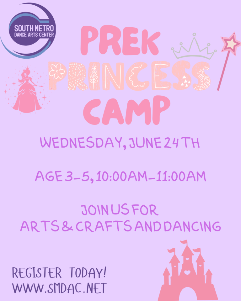 Calling all little princesses! Join us at South Metro Dance Arts Center for a special PreK Princess Camp on Wednesday, June 24th from 10:00am–11:00am, designed just for children ages 3–5.