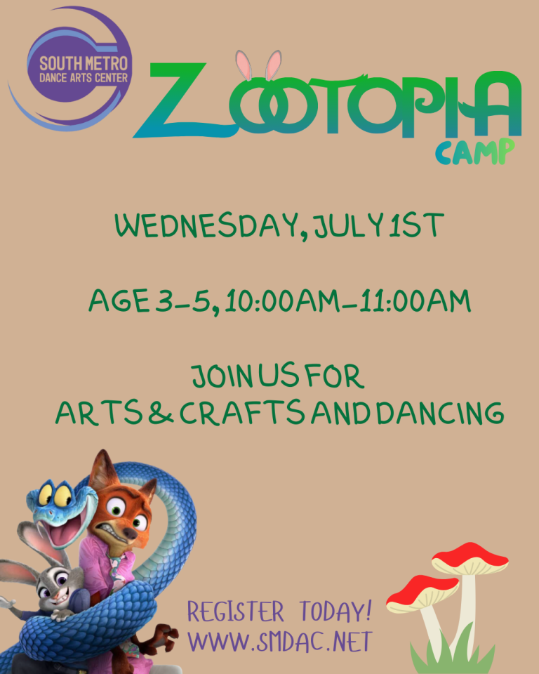 Step into the exciting world of Zootopia at South Metro Dance Arts Center! Join us for a fun-filled Zootopia Camp on Wednesday, July 1st from 10:00am–11:00am, designed for children ages 3–5.